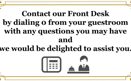 『質問がある方は0をダイヤルしてフロントまでご連絡ください喜んでお手伝いいたします』Contact our Front Desk by dialing 0 from your guestroom with any questions you...
