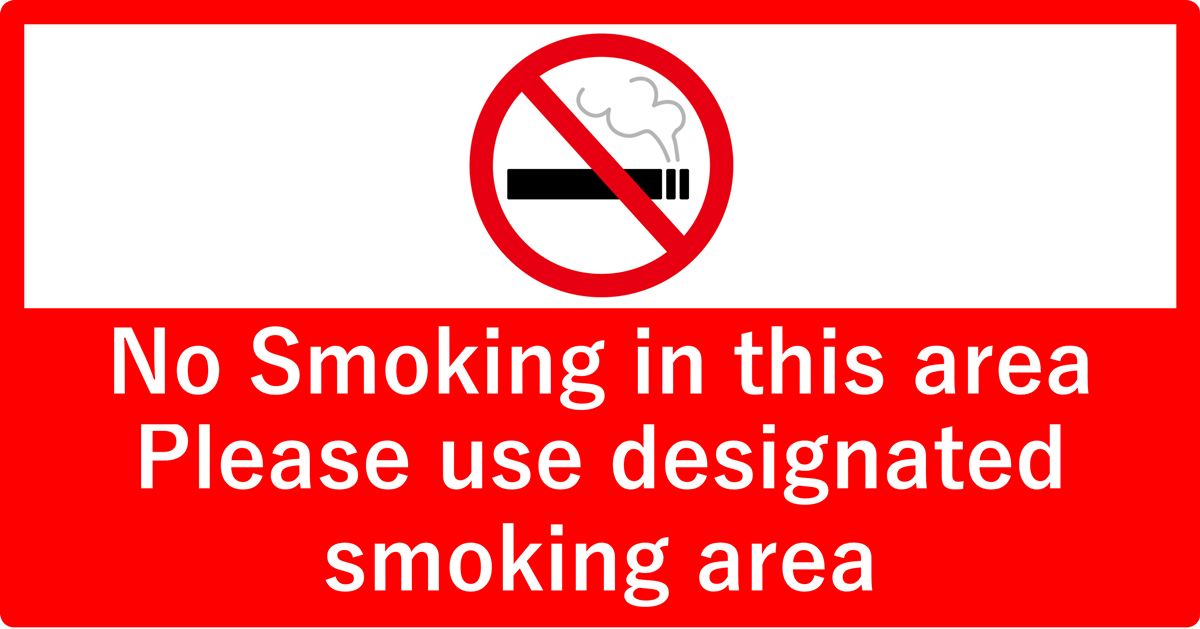 今回の案内サインを日本語に訳し直すと「この場所は禁煙です。指定の喫煙所をご利用ください。」という意味になります。