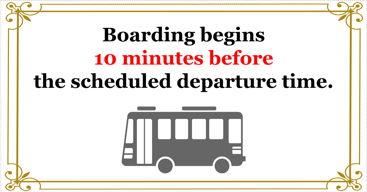 バスだけでなく、船(観光船、遊覧船、フェリー)や電車や飛行機の乗車にも使える便利な表現です。口頭や文章でのご案内で使えます。