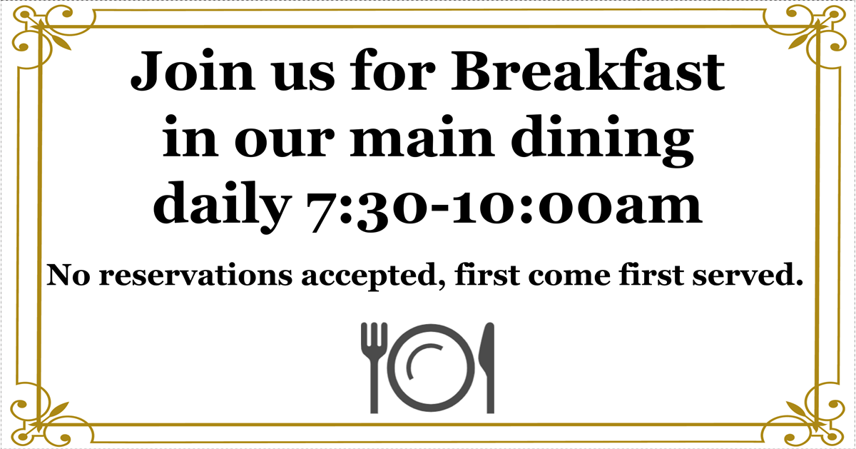 Join us for Breakfast in our main dining daily 7:30-10:00am
