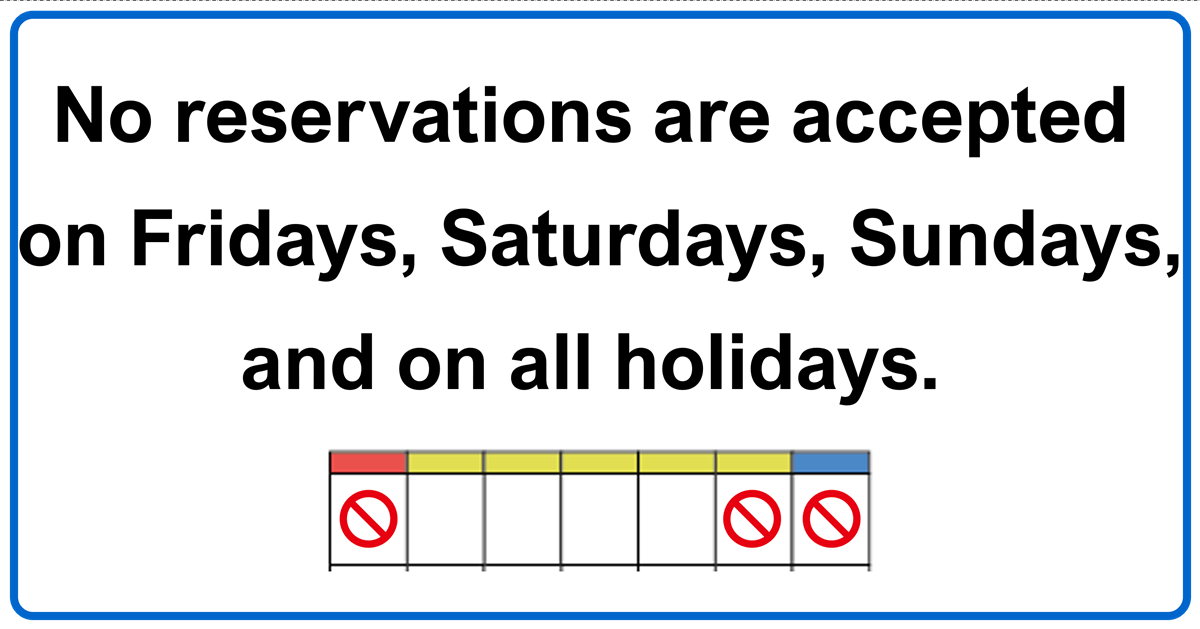 No reservations are accepted on Fridays, Saturdays, Sundays, and on all holidays.