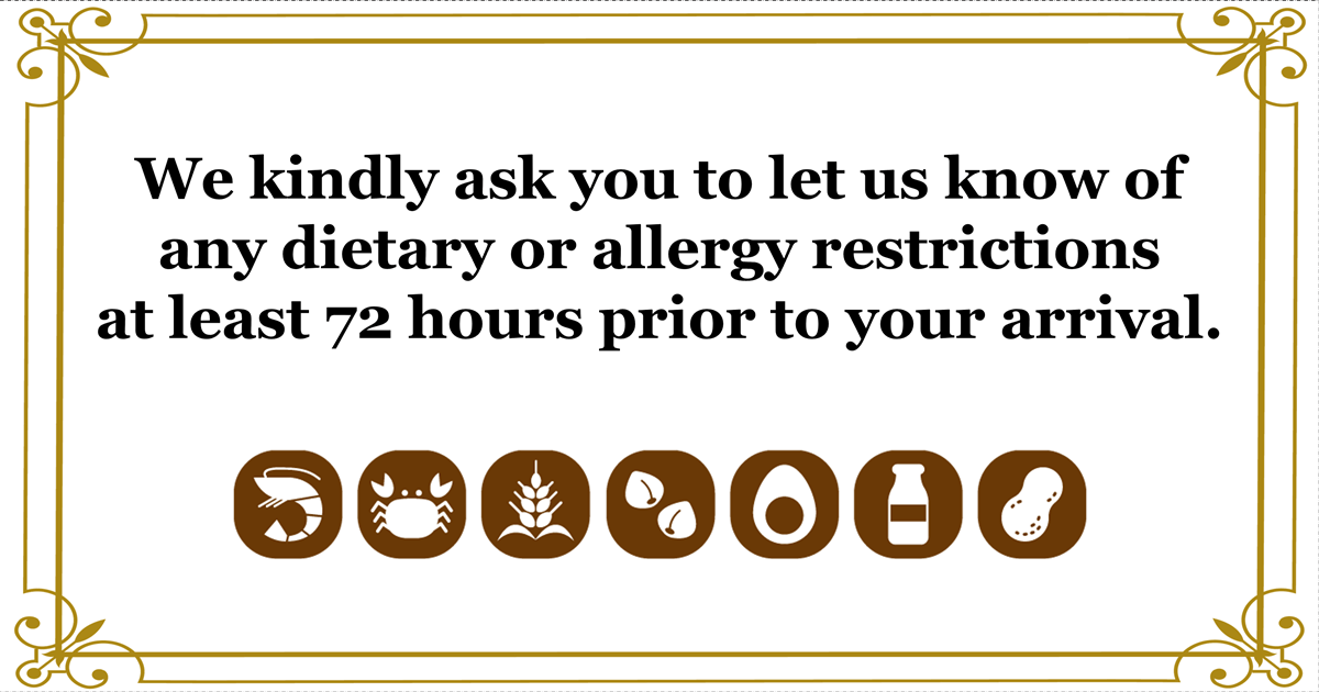 We kindly ask you to let us know of any dietary or allergy restrictions at least 72 hours prior to your arrival.