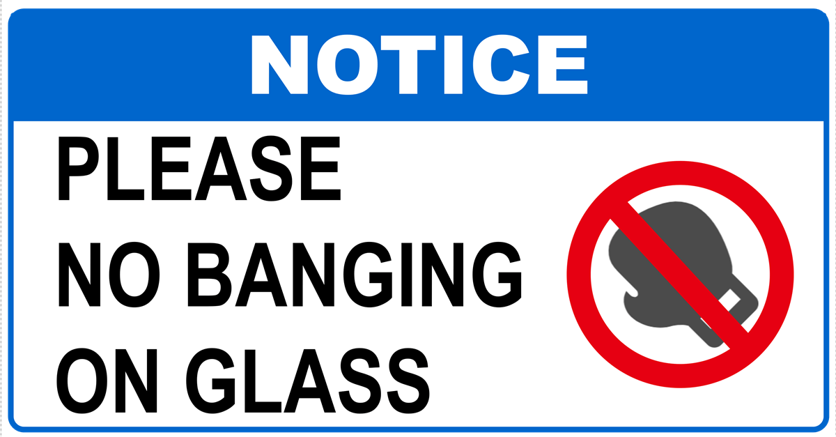 口語で言う時は“notice”は省き、“Please no banging…”と使います。目の前でガラスをたたいている人に対して使うようなイメージです。目の前にガラスがある状態で、たたいていない相手(たたく前の相手)にも使えますが、「私がたたきそうに見えるってこと?」と受け止められて失礼になるかもしれません。